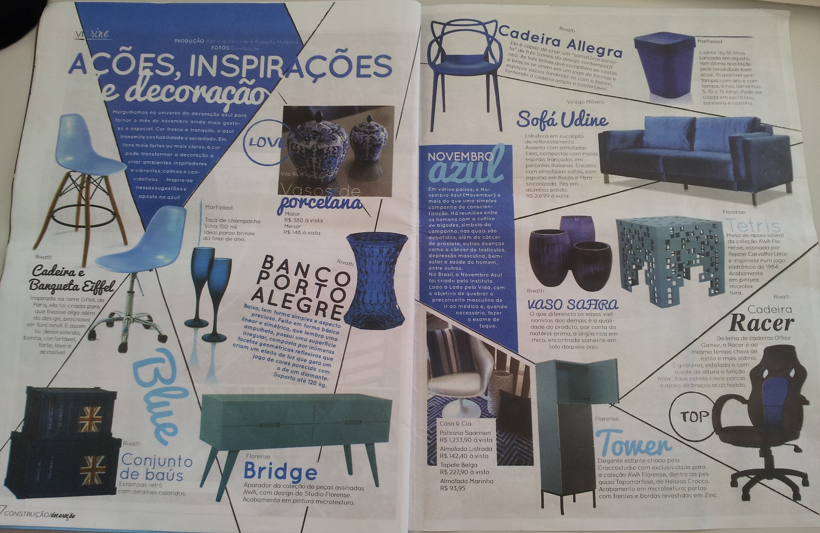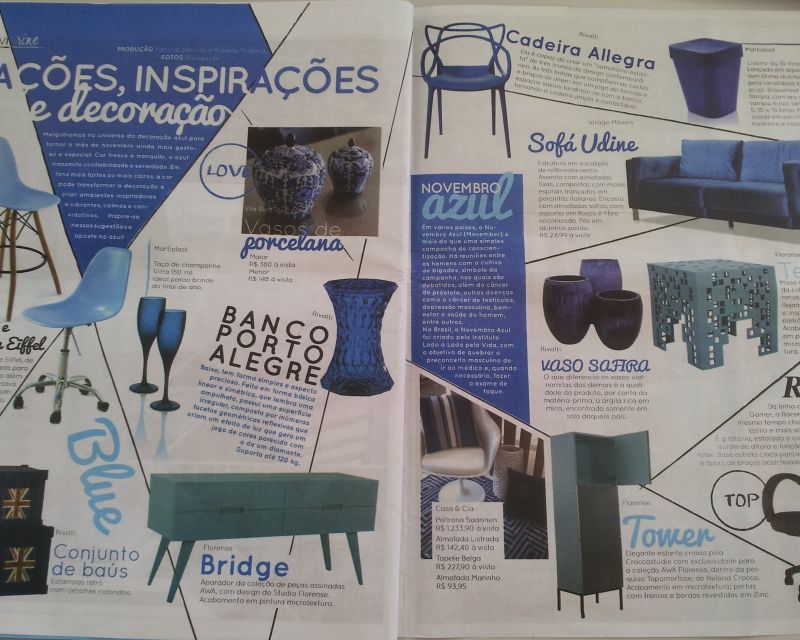 Entre os produtos nas cores azuis, destaque para as cadeiras Allegra e Racer, banco Porto Alegre Rivatti, banqueta e cadeira Eiffel, vaso Safira e conjunto de baús.