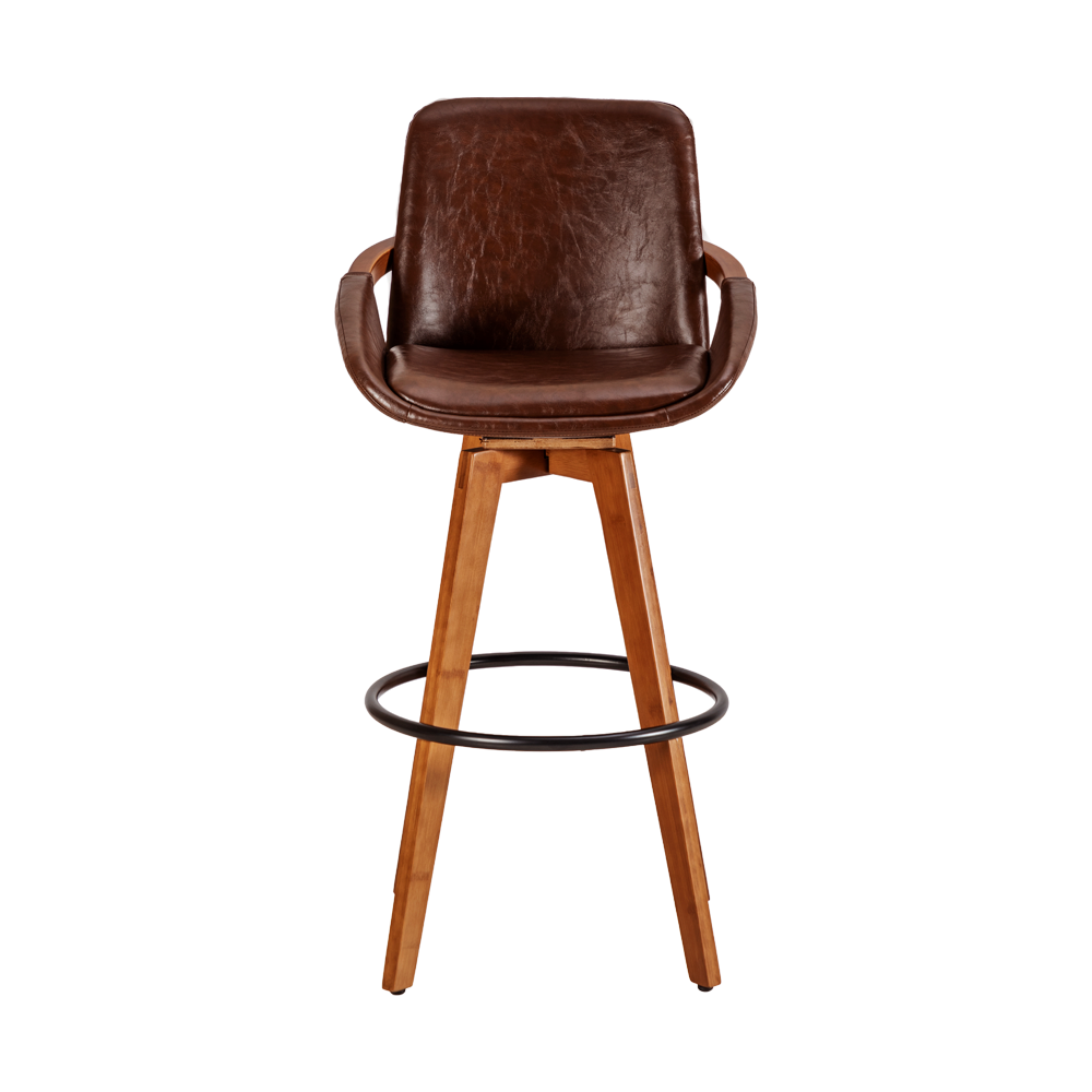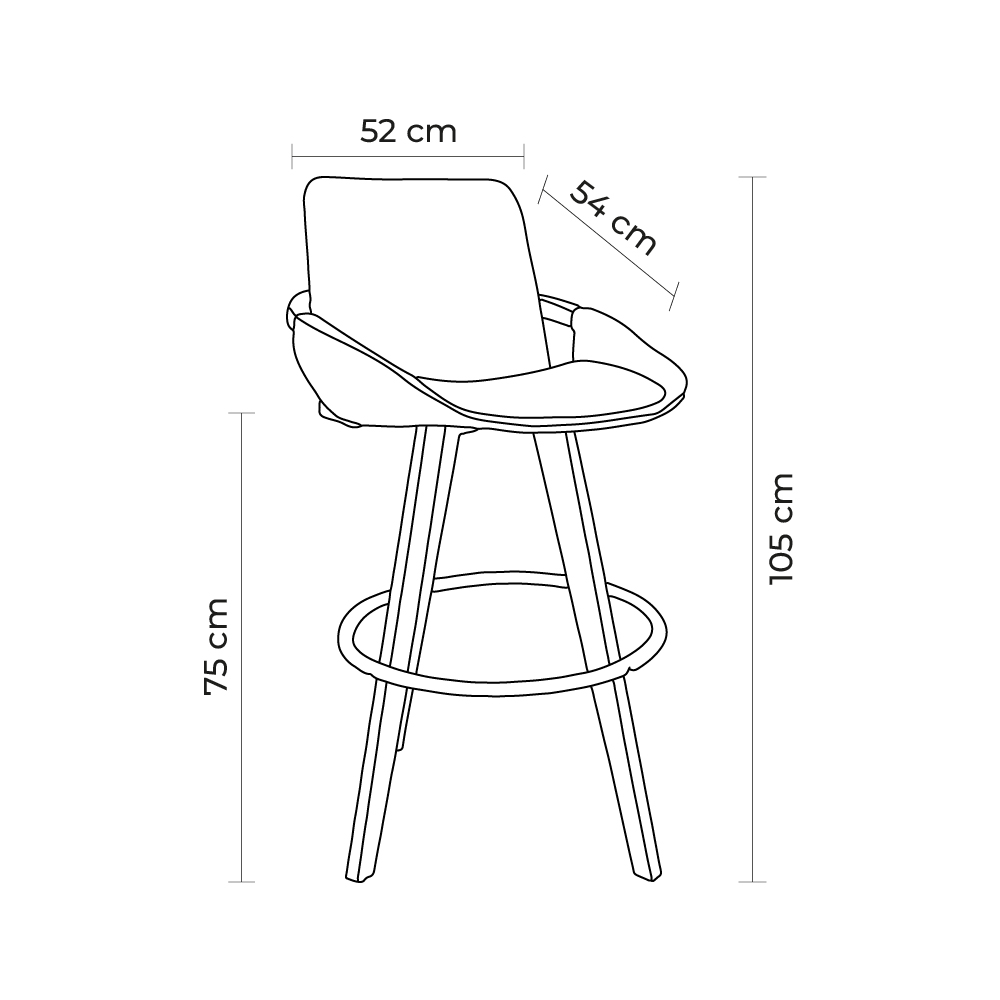Banqueta em madeira multilaminada • Assento e encosto estofados em poliuretano ou linho • Base giratória em madeira com apoia-pés em aço pintado a pó.