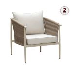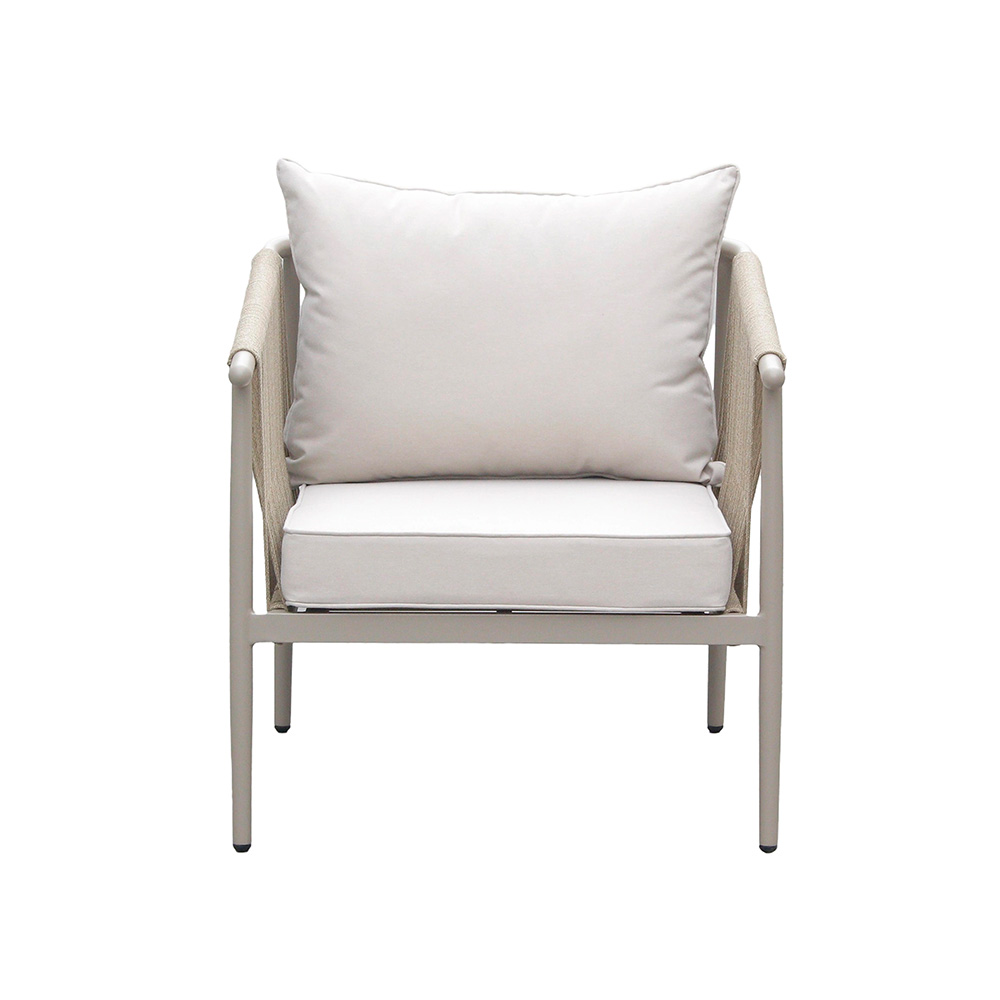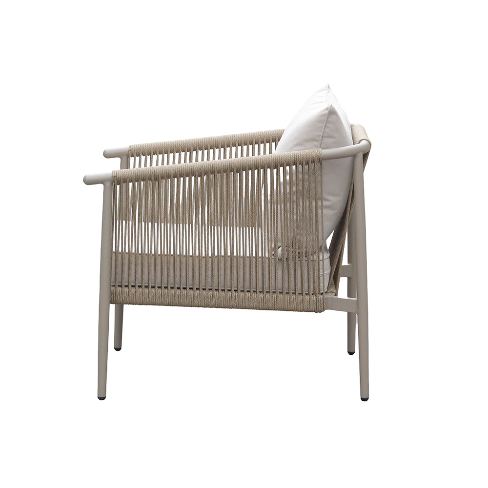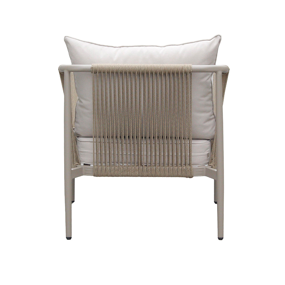 Poltrona em estrutura de alumínio pintada a pó com corda náutica tramada a mão com proteção UV. Almofadas do encosto e assento em tecido acquablock com proteção UV, espuma de secagem rápida.