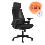 Cadeira giratória com regulagem de altura, sistema relax e braço 3D • Assento em tela mesh • Base e rodízios em nylon • Possui apoio de cabeça. Garantia de 5 anos.