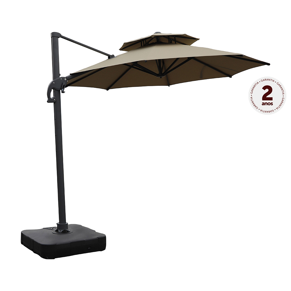 Ombrelone lateral para uso externo. Estrutura em alumínio com pintura à pó. Cobertura de 3m em formato redondo com tecido poliéster 250g/m² impermeável, revestido com poliamida e proteção UV. Rotação 360º acionada por pedal, manivela para abertura e inclinação com 6 posições. Não acompanha base.