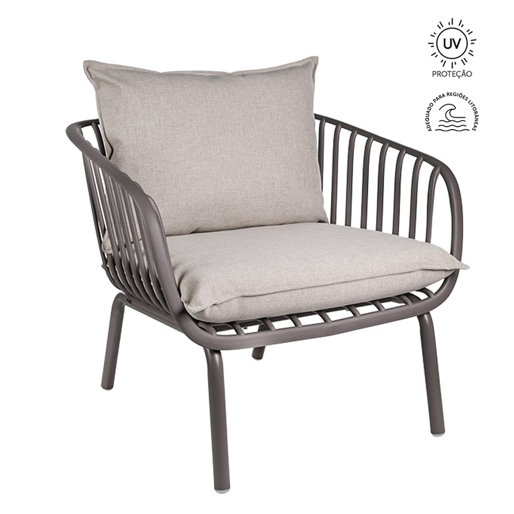 Poltrona em polipropileno com proteção UV • Pés em metal pintado à pó • Acompanha almofadas para assento e encosto com tecido acquablock.