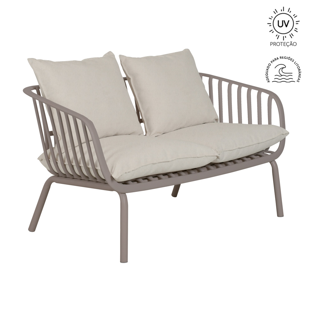Sofá em polipropileno com proteção UV • Pés em metal pintado à pó • Acompanha almofadas para assento e encosto com tecido aquablock.